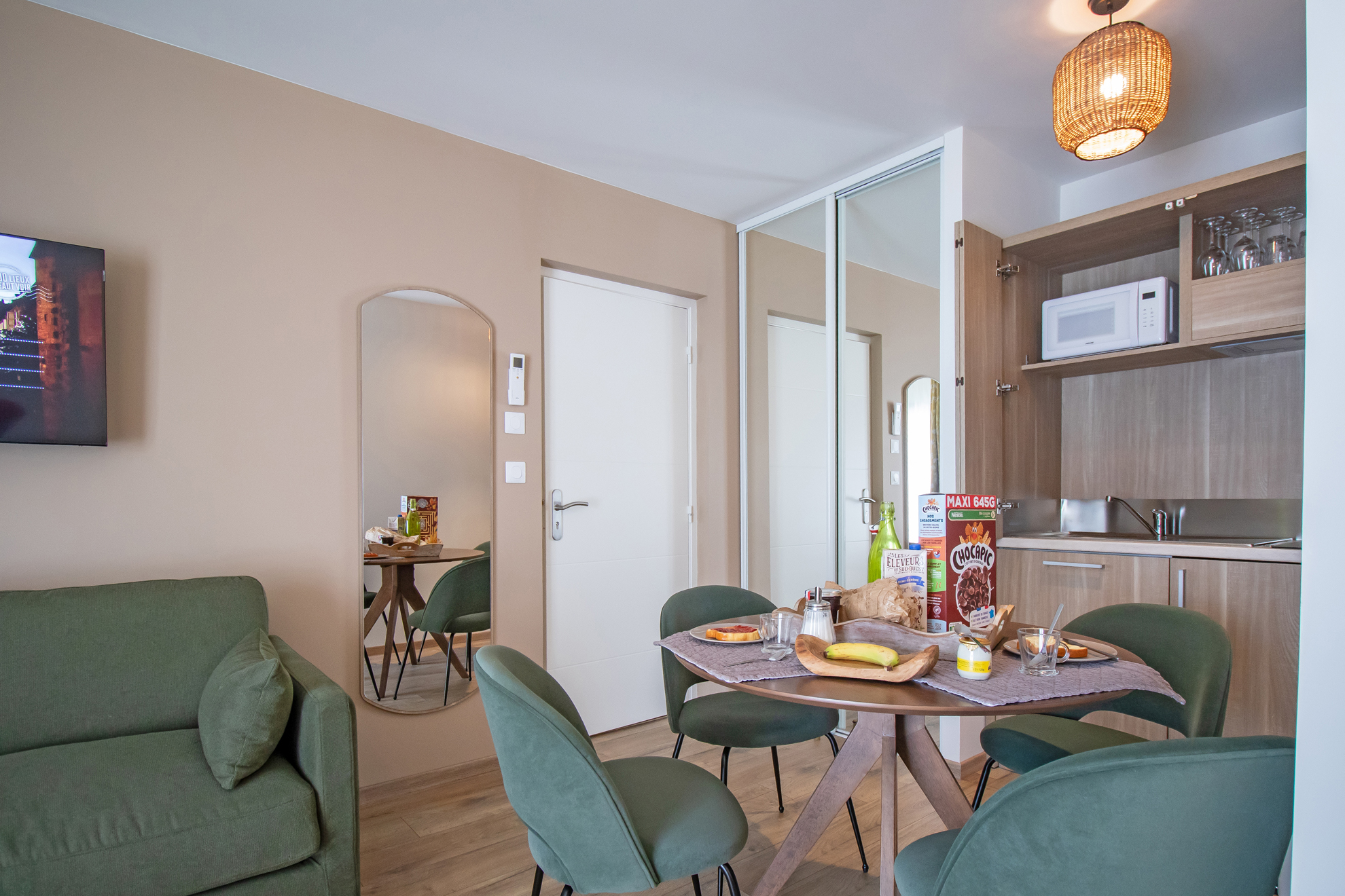 En plus, la Kitchenette est entièrement équipée (frigo, plaque de cuisson, micro-onde, vaisselle pour 6 personnes) et dispose d’une machine à café Nespresso et bouilloire pour vous permettre de commencer votre journée en toute sérénité.
